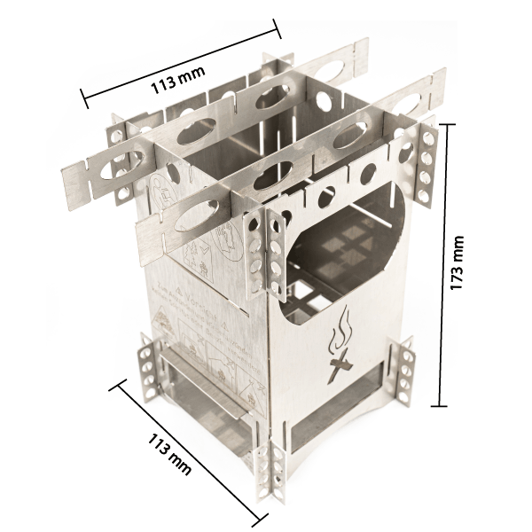 Durch die Multifuel-Ausstattung kann er mit Holz, Kohle, Rinde, Festbrennstoff, Tierdung, Spiritus- oder Gelkocher betrieben werden.